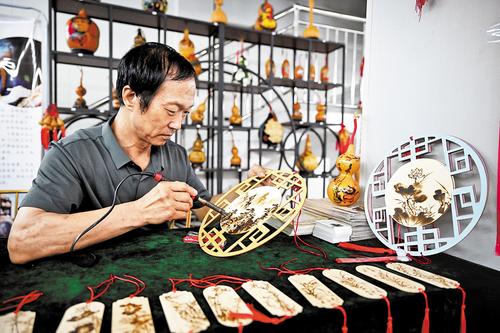 9月16日,在邢台市抗大1940街区非遗工坊,木板烙画技艺传承人卢金芳现场展示木板烙画技艺。