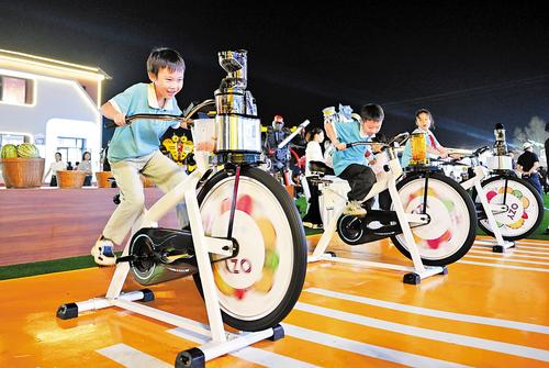 9月15日,在“县”在出发·河北县域特色产业赋能文旅市集上,小朋友体验自行车健身器材。